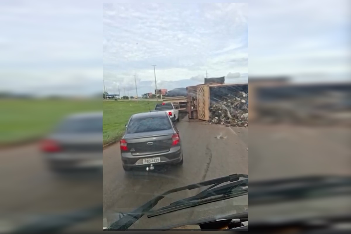 Um caminhão carregado com entulho tombou, na manhã desta segunda-feira (15/12), na BR-070, sentido Águas Lindas (GO). Segundo a Polícia Rodoviária Federal (PRF), não houve vítimas.
