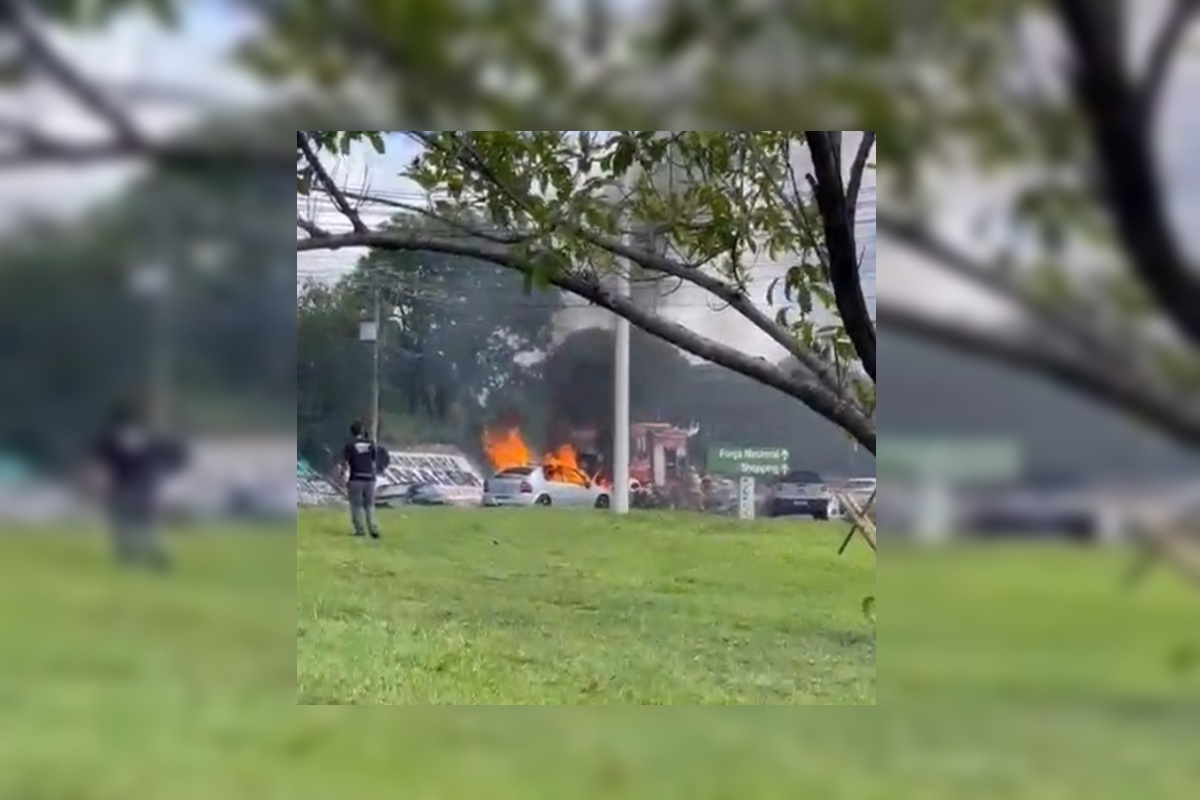 Carro fica destruído após pegar fogo e assusta motoristas no DF